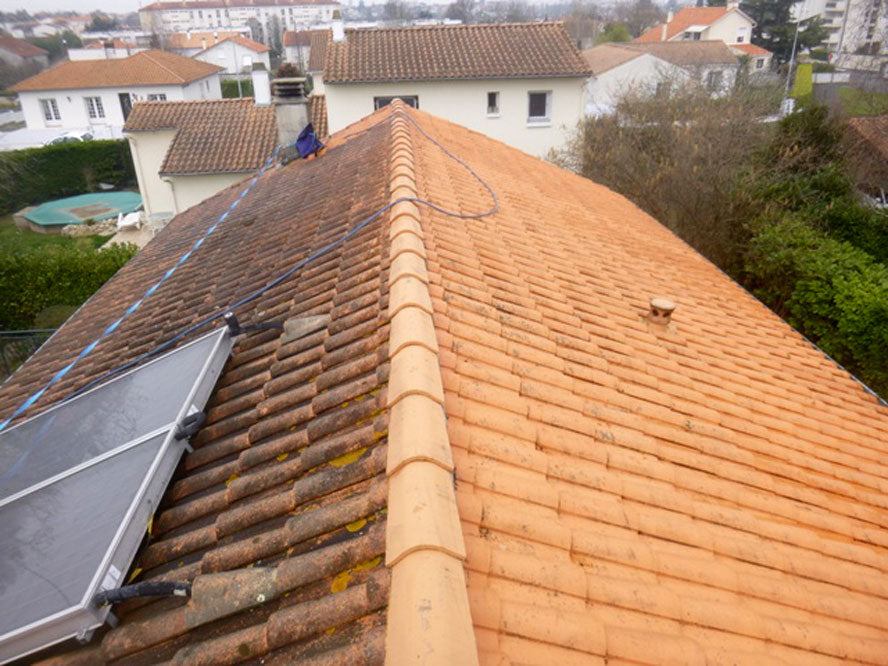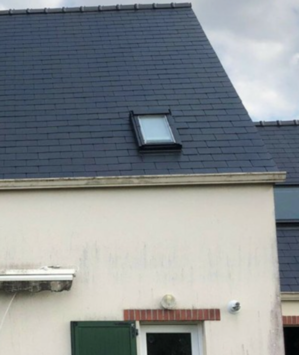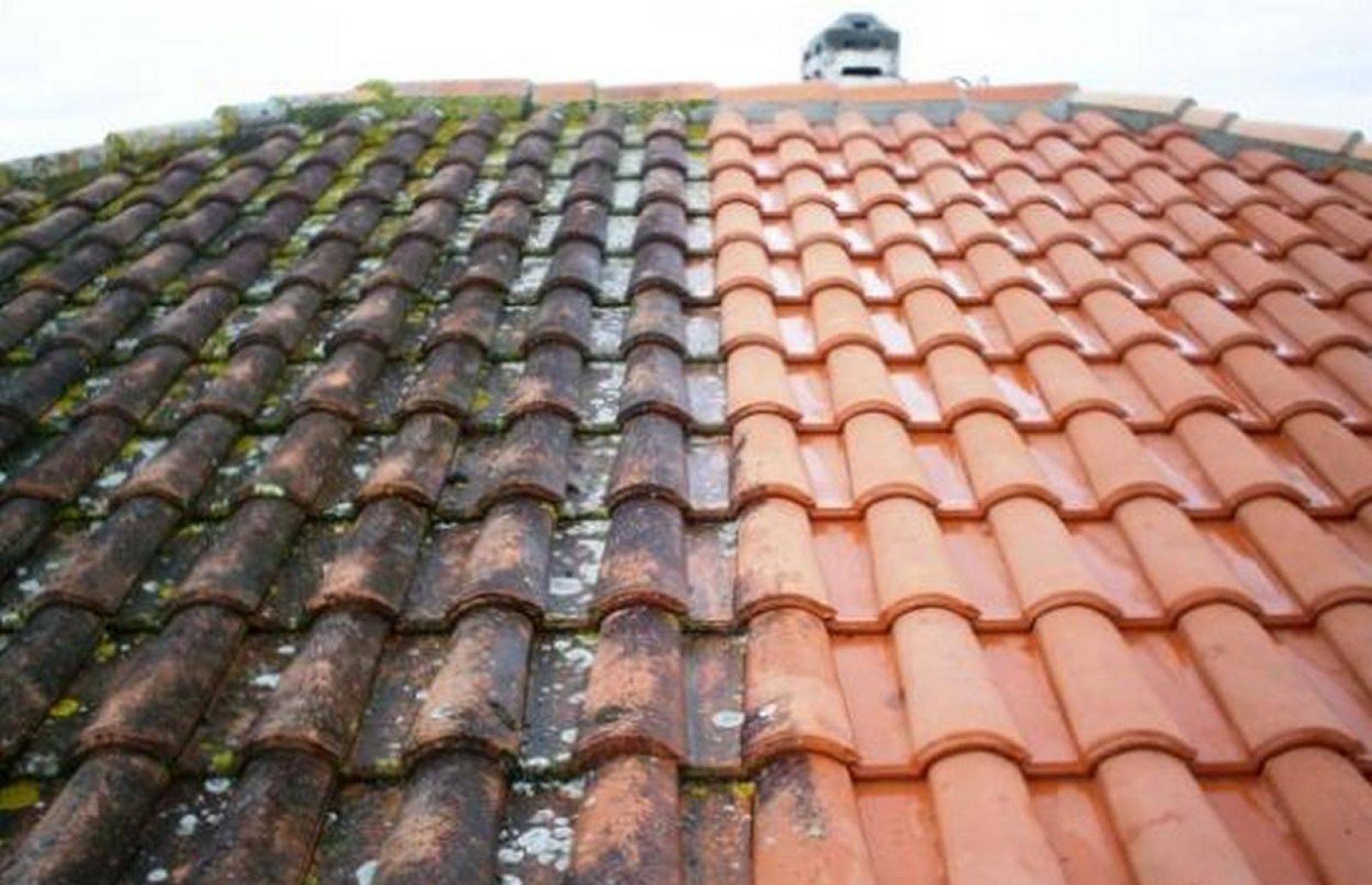 Nettoyage et démoussage de toiture. Résultat impeccable, le toit a retrouvé sa couleur d’origine.
