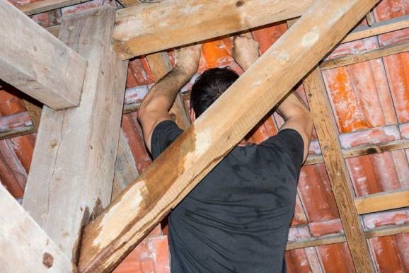 Réparation des fuites, repositionnement des gouttières et ajout de descentes pluviales si nécessaire.