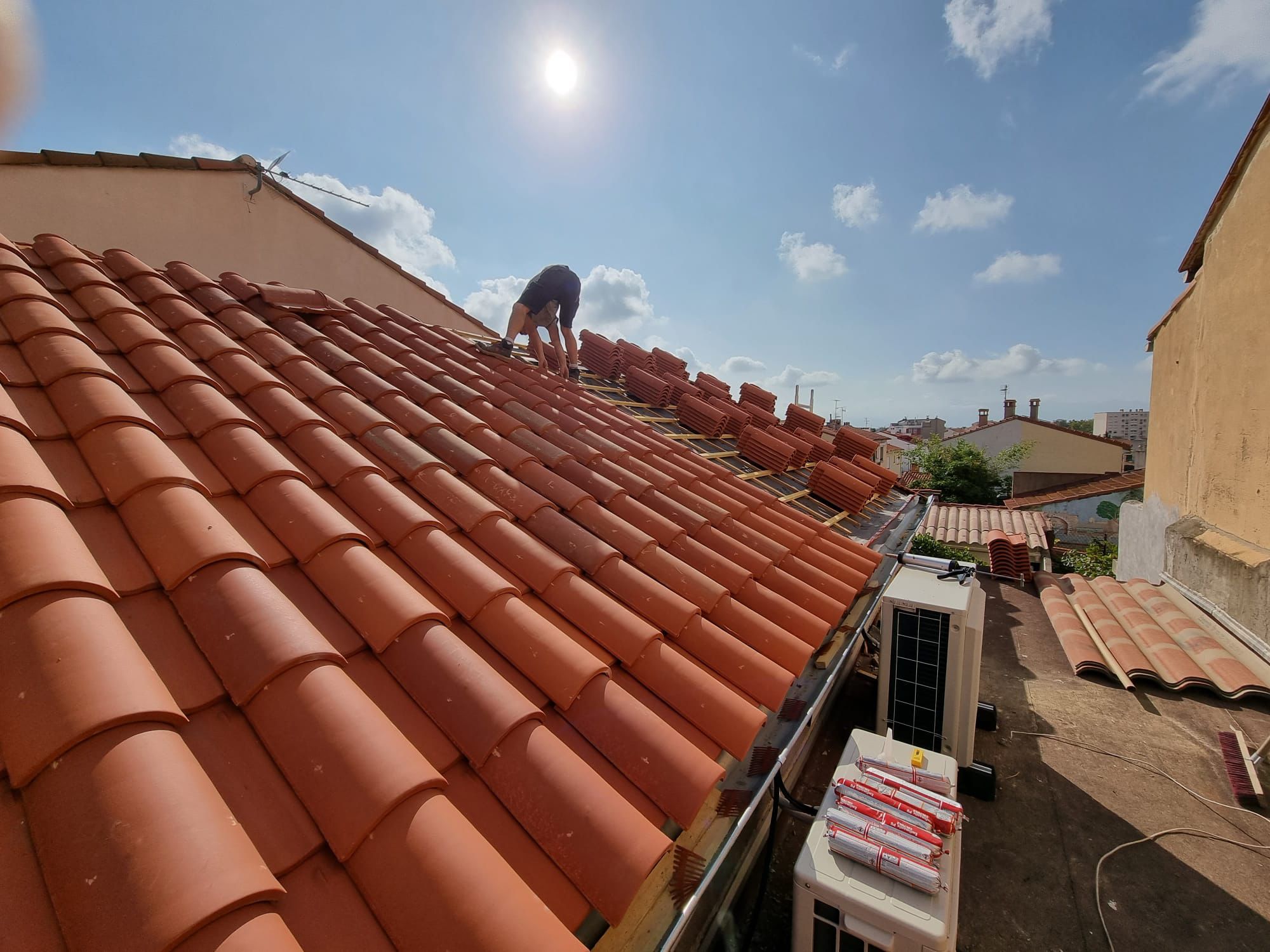 Remplacement des éléments défectueux (tuiles, ardoises, solins, noues) pour stopper la fuite.